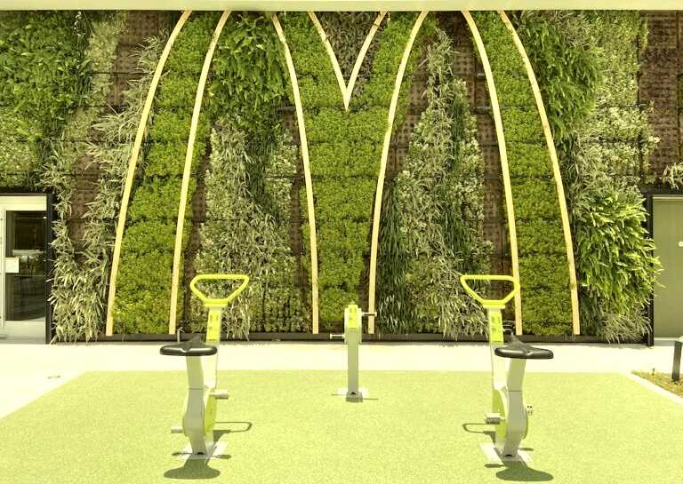 Il grande dehors esterno permette ai clienti di consumare hamburger e patatine piacevolmente, mentre le strutture ombreggianti “raccolgono” i raggi solari attraverso gli appositi pannelli fotovoltaici. Due ciclette – una per le gambe ed una per la braccia – possono far divertire i clienti ad illuminare il famigerato logo del brand grazie all’energia pulita così prodotta.