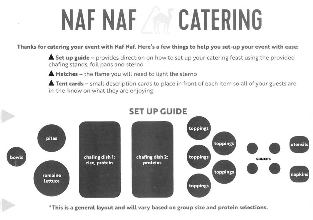 La grande attenzione per il cliente di Naf Naf passa attraverso anche piccole iniziative. Un esempio è quella che riguarda il servizio di catering. Il brand desidera infatti offrire ai “clienti catering” la stessa esperienza personalizzabile che offre ai “clienti singoli” e ha deciso così di aiutarli grazie ad una vera e propria guida per l’ordine catering. La guida è composta tra l’altro da una “mappa” che suggerisce al cliente come impostare il layout dell’area in cui predisporre le pietanze, dalle proteine ai condimenti.