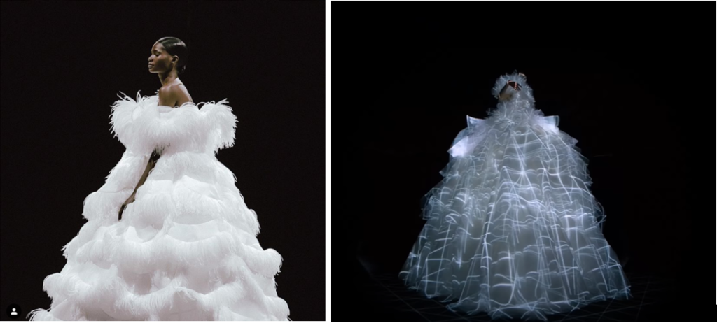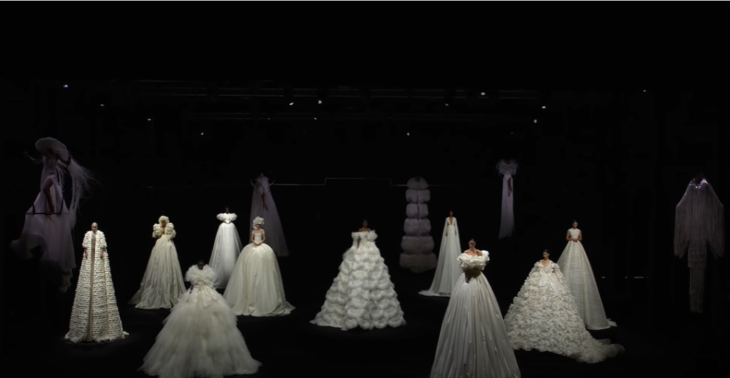 Si illumina il centro ruotando su se stesso; in un piedistallo fa capolino la prima modella con il primo abito della collezione. Riempie la scena grazie alle sue fattezze, i tessuti che lo compongono lo rendono così immenso da riempire lo sguardo e lasciare chi guarda, per un frangente, senza fiato.