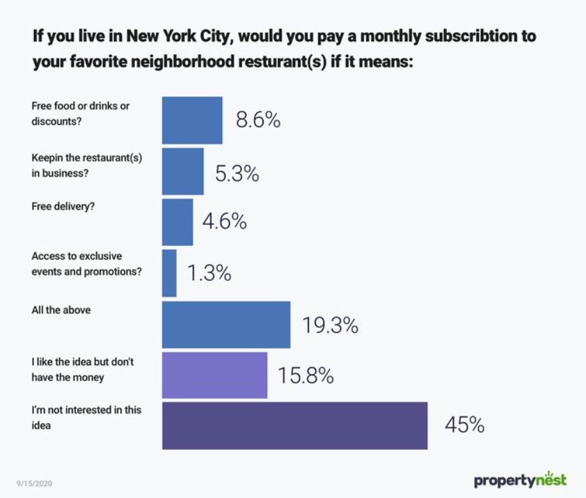 L’iniziativa ha destato l’interesse di altri colossi del quick service. Le acque si muovono attorno alle iniziative “in abbonamento”, tanto che la società Property Nest, specializzata nell’intermediazione di affitti per immobili privati e commerciali, ha condotto un sondaggio su 1000 abitanti di New York per capire se gli “abbonamenti al ristorante” sarebbero ben accolti nella Grande Mela. I risultati: