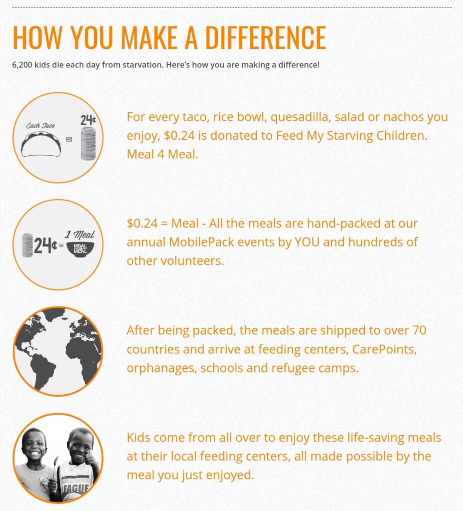 Per ogni taco, ciotola di riso, quesadilla, insalata o nachos acquistati, un bambino affamato riceve un pasto tramite Feed My Starving Children. Tutti i pasti vengono confezionati a mano durante i nostri eventi annuali di MobilePack e spediti in oltre 70 paesi, dove vengono ricevuti dai bambini bisognosi.
