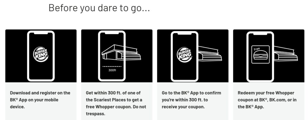 L’app Burger King invierà anche notifiche push ai clienti quando si troveranno nelle vicinanze di un “luogo spaventoso”, purché abbiano acconsentito a tali avvisi. Il marchio condividerà anche le coordinate esatte dei luoghi più spaventosi attraverso i suoi vari canali social media e tramite il sito web.