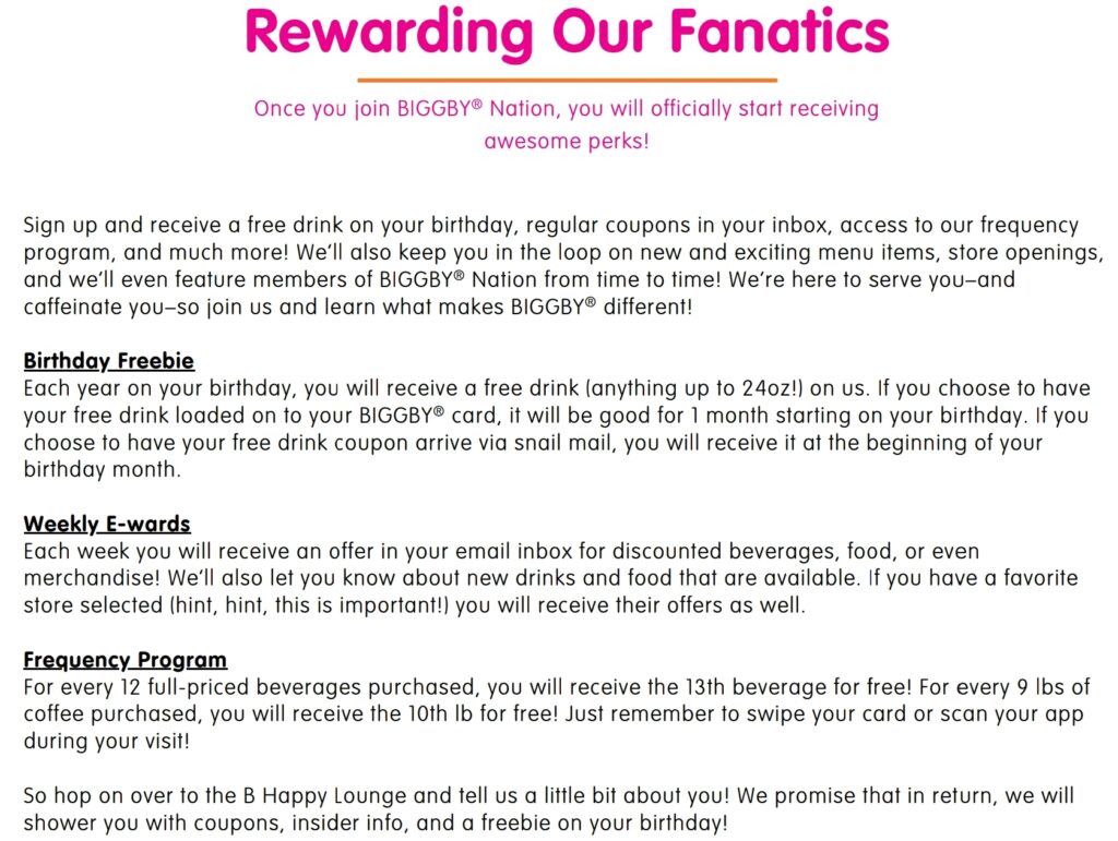 I Fan sono premiati da Biggby Coffee: regali di compleanno, offerte settimanali e tutti i vantaggi di un programma fedeltà sono previsti per tenersi stretti questi clienti speciali.