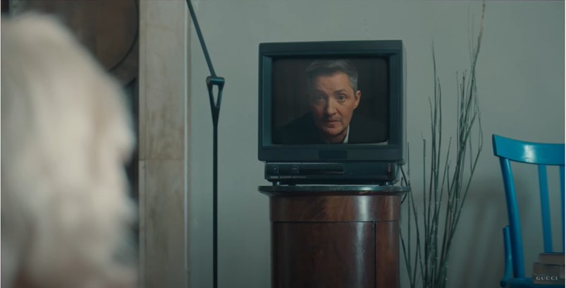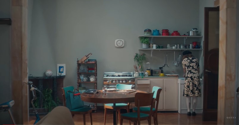 La sola presenza dei componenti d’arredo lascia spazio a una prima figura: è una ragazza, cammina, attraversa la stanza, si reca in cucina intenta a fare qualcosa. La sua presentazione coincide con la presentazione della collezione Gucci: abiti d’alta moda fruibili, indossabili da chiunque in qualsiasi contesto; dall’alto al quotidiano, dalla passerella illuminata al parquet di casa, solleticato da un basso tacco nero squadrato e una calza bianca in contrasto tonale.