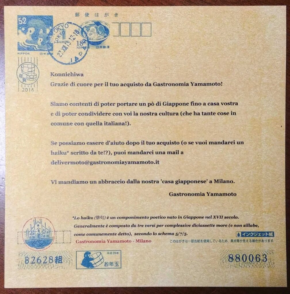 Non potevo farmi scappare questa maglietta perchè Gastronomia Yamamoto e Uniqlo sono due brand che amo e poterli indossare è una gioia, un segno di appartenenza che sfoggio con orgoglio. All’interno del pacchetto anche una piccola, fantastica, sorpresa: una lettera per me, stampata su carta di qualità, per ringraziarmi. Eccola qui: