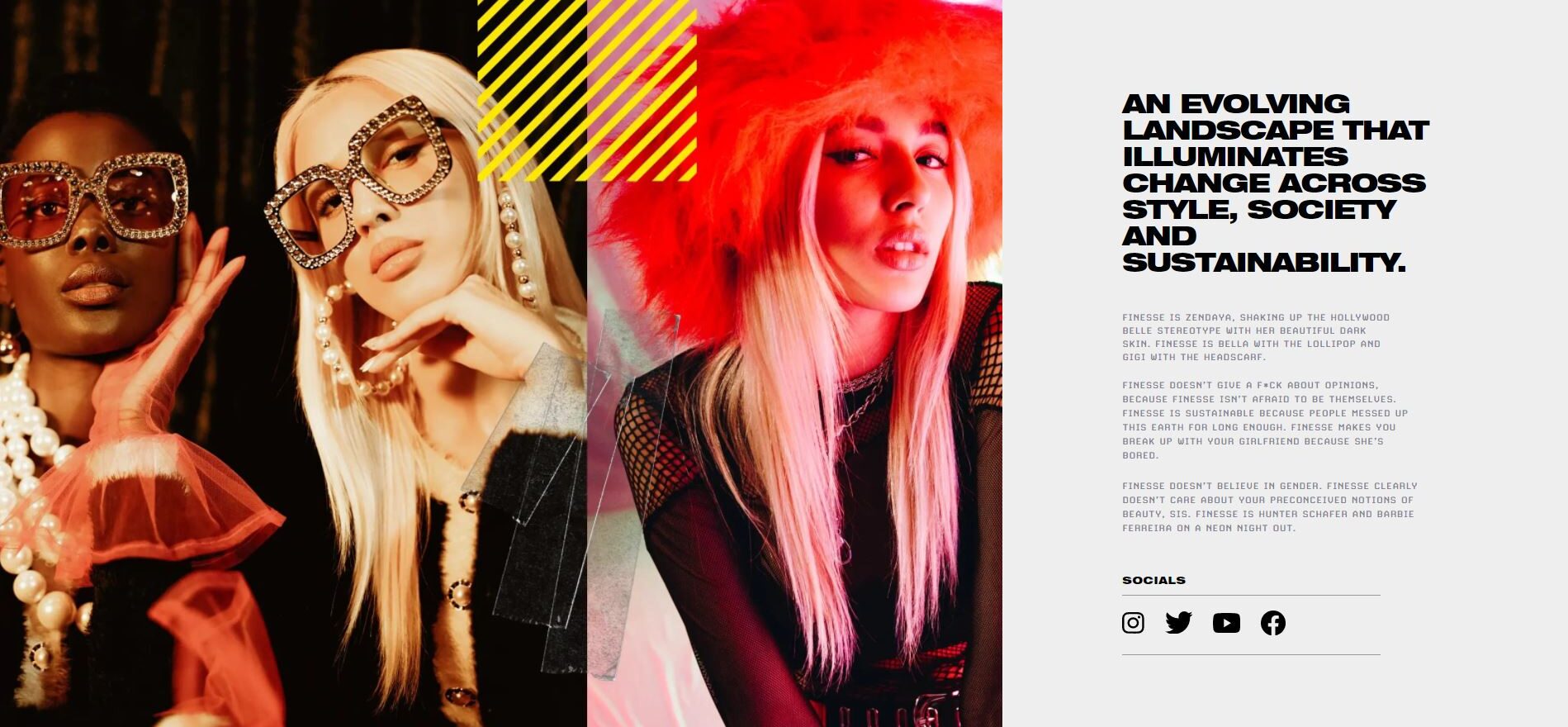 FINESSE opera nel campo della moda, come brand particolarmente specializzato per giovani e giovanissimi, mercato che vuole letteralmente sconvolgere grazie alla tecnologia e ad un assunto semplice, ma non banale: le tendenze fashion si stanno spostando dalle passerelle al web, dove ormai da anni spopolano influencer, celebrità e fashion blogger.