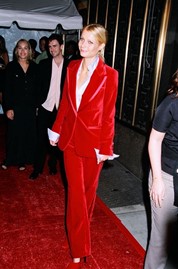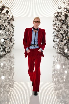 Ed è così che si entra e ci si tuffa nella sfilata vera e propria: flash, neon, luci a intermittenza e una colonna sonora assai calzante per il contesto presentato[1]. Outfit dopo outfit, siamo in grado di ritrovare le radici della maison e i riferimenti iconici per eccellenza. Uno degli esempi più eclatanti è l’outfit total velvet con cui Tom Ford nel 1996 rese Gucci uno dei più importanti protagonisti della moda contemporanea (da ricordare, inoltre, che l’attrice Gwineth Paltrow indossò lo stesso tailleur proprio nel ’96 in occasione degli MTV VMA).