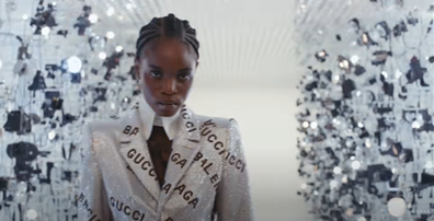 Continuano a scorrere silhouette femminili e maschili, in cui spesso e volentieri non esiste genere. Gli elementi della maison fanno capolino (appare anche un coniglietto bianco in braccio a una delle modelle: riferimento al Gucci Garden? Probabile). Tutto, come sempre, non è dato al caso; ogni singolo movimento, ogni singola proiezione, flash, canzone, abito e scritta, ha qualcosa dentro di sé da raccontare e lo fa, minuto dopo minuto, fino alla fine del film.