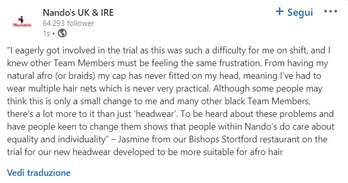 In poche parole, Nando’s sta testando un copricapo adatto ai collaboratori dei punti vendita con le ingonbranti chiome afro. Come dice Jasmine, non si tratta di una rivoluzione copernicana, ma di un’accortezza verso il dipendente che può davvero far la differenza in termini di comodità, orgoglio e benessere, senza dimenticare la cultura sudafricana di cui è portavoce il brand, così ancor più sottolineata e rispettata!