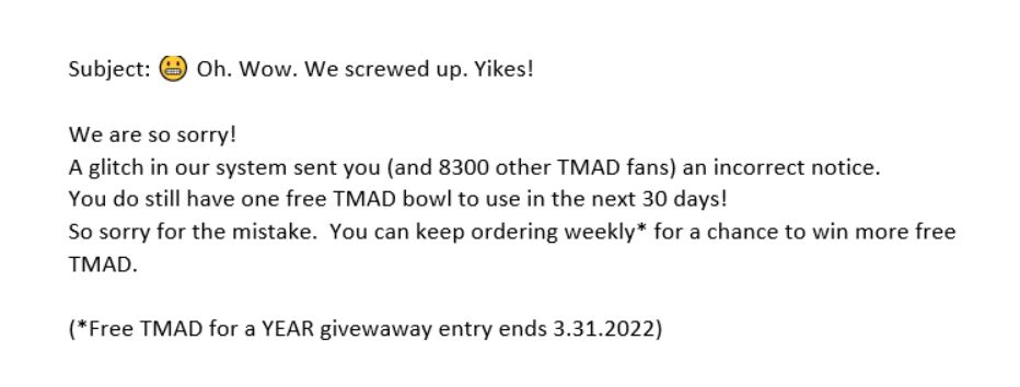 Dopodichè l’idea brillante: tre settimane dopo, Teriyaki Madness ha inviato un’altra email agli 8300 clienti, che recitava: