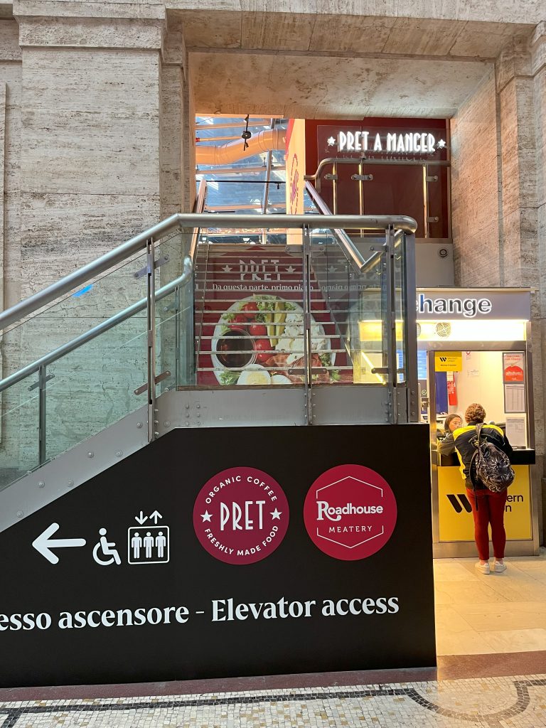 Scendo dal treno e vado subito a cercare Pret. Alle 9:47 sono di fronte all’ingresso del locale, che è ben segnalato, ma purtroppo un po’ penalizzato dai lavori in corso in stazione, che prevedono la presenza di grandi pannelli proprio di fronte all’ingresso tramite le scale. Queste ultime sono ben visibili grazie ai loghi e a immagini di prodotto. Sono abbastanza pulite, ma non impeccabili: una piccola cosa, ma in un format che promette freschezza e immediatezza anche il dettaglio conta.